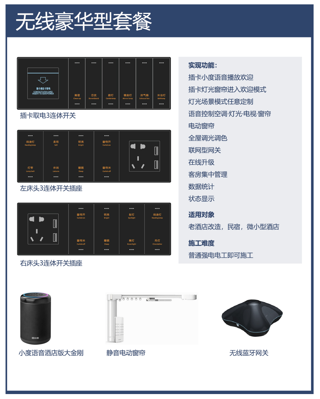 方案導(dǎo)讀:智慧酒店解決方案優(yōu)勢(shì)在于零布線,不停業(yè),少換新,適用于老酒店改造,民宿,微小型酒店。以下兩種套餐適用于各種類型酒店智能配套僅供參考。